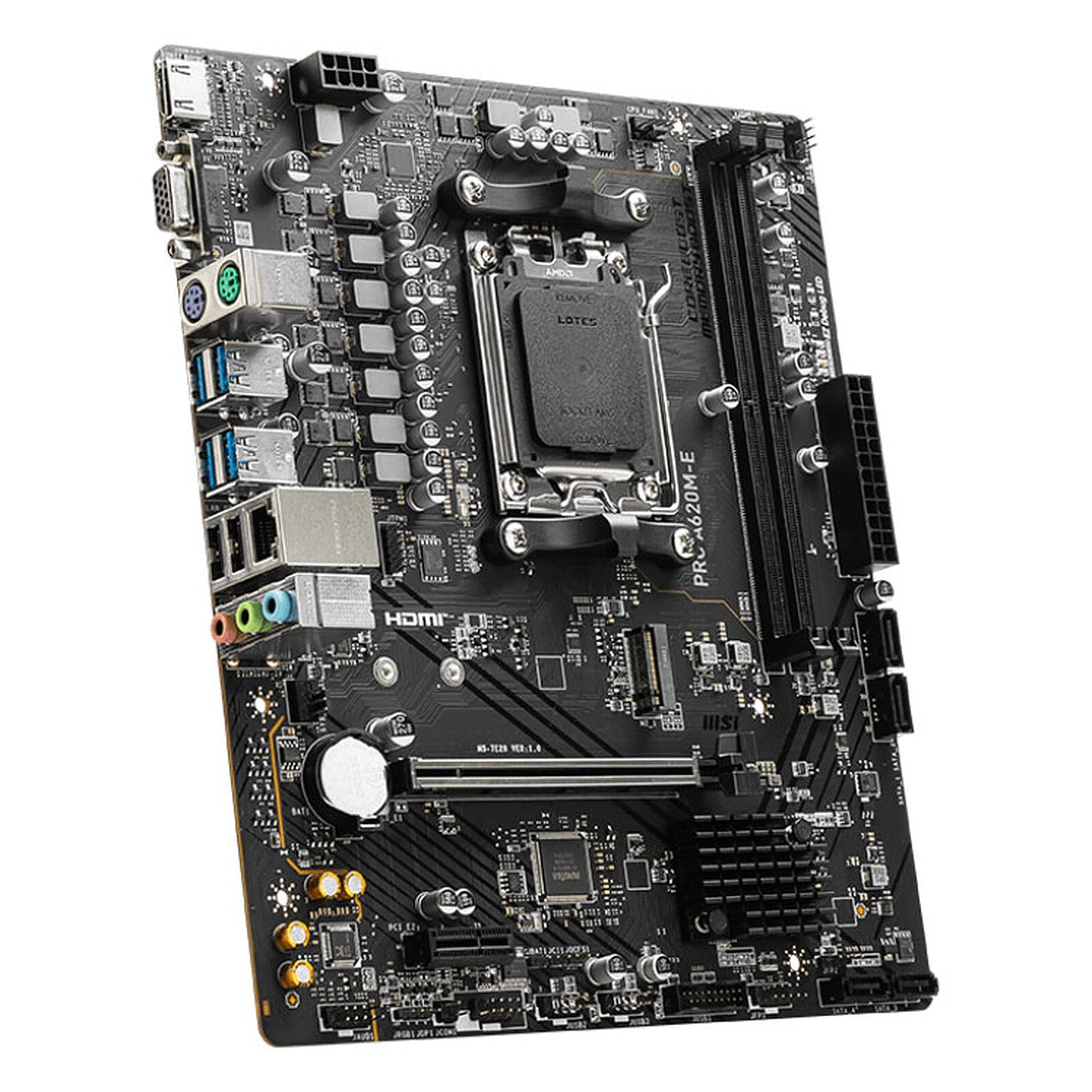La MSI PRO A620M-E est une carte mère polyvalente pour processeur AMD Ryzen sur socket AM5. Elle permettra de concevoir un PC bureautique et multimédia à base de composants récents tels que les processeurs AMD Ryzen 7000, les cartes graphiques PCI-Express 4.0 16x, les disques M.2 NVMe PCIe 4.0 ou encore la RAM DDR5. La carte mère PRO A620M-E issue de la gamme PRO de MSI se plie aux exigences des professionnels en alliant durabilité et fonctionnalités essentielles.